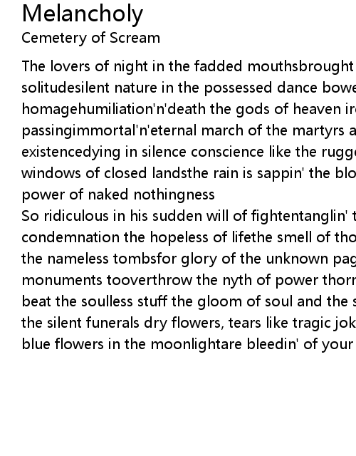 | So ridiculous in his sudden will of fightentanglin' the legs in mazes of eternal condemnation the hopeless of lifethe smell of thousands of candles burnin' on the nameless tombsfor glory of the unknown pagan deities you're overthrowin' the monuments tooverthrow the nyth of power thorn of rose hurts your handtoo weak to beat the soulless stuff the gloom of soul and the sea of destinymelancholy of the silent funerals dry flowers, tears like tragic jokersno one know your name blue flowers in the moonlightare bleedin' of your voice |
