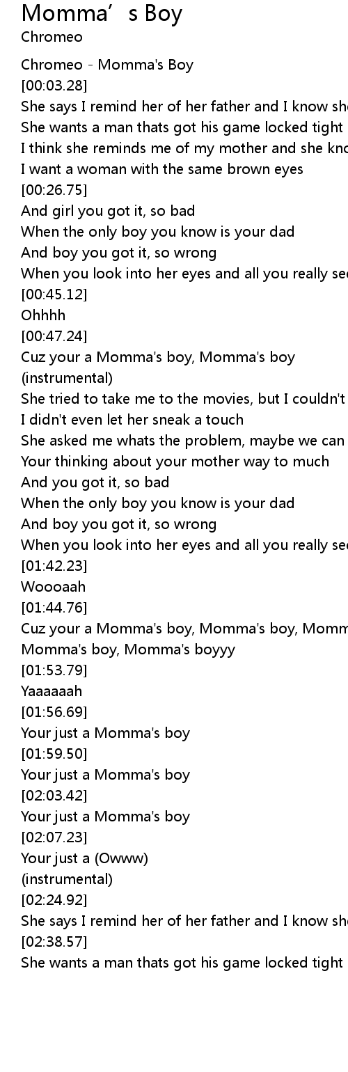 Cuz your a Momma's boy, Momma's boy, Momma's boy, Momma's boy, your a Momma's boy, Momma's boyyy |