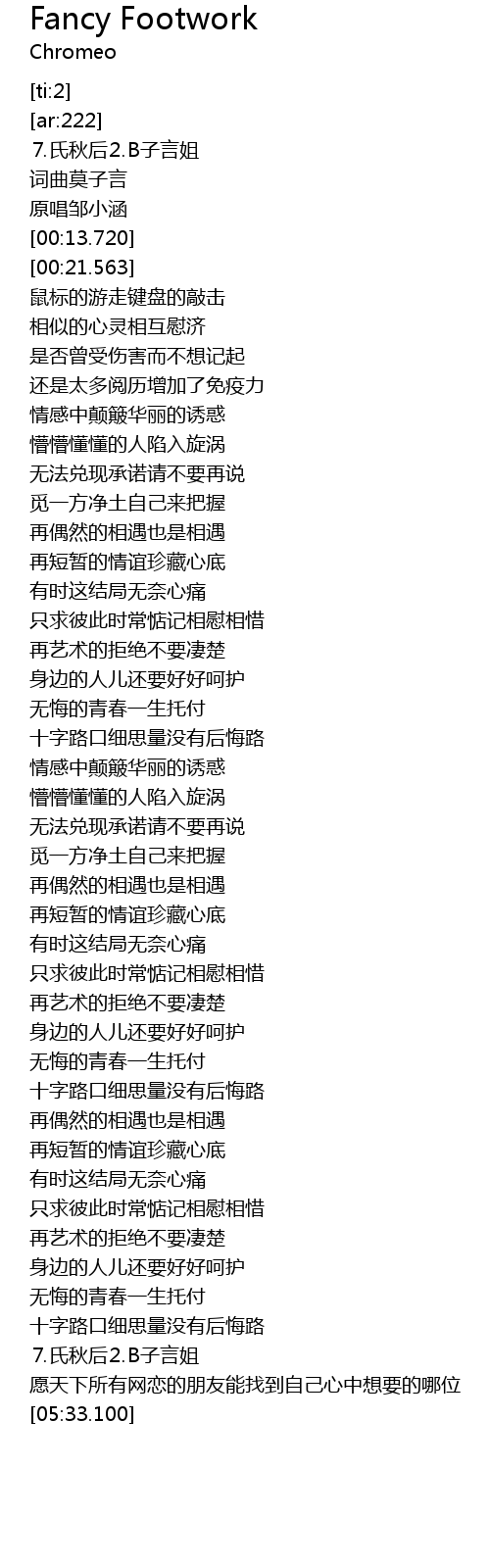 | [05:23.842] | 愿天下所有网恋的朋友能找到自己心中想要的哪位 |