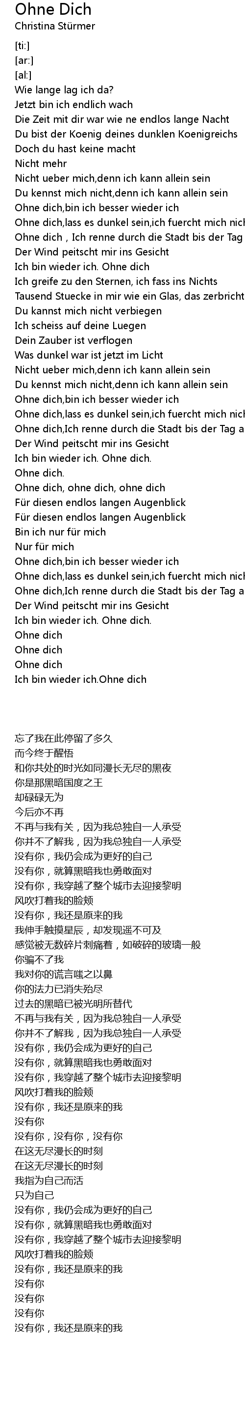 | [01:46.520] | Ohne dich,lass es dunkel sein,ich fuercht mich nicht |