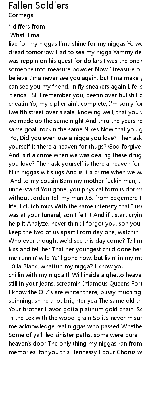 The Sqwad's "Fallen Soldiers b/w Straight No Chaser" 12" [Cormega] What, I'ma live for my niggas I'ma shine for my niggas Yo we bled for hours, now I learn to dread tomorrow Had to see my nigga Yammy dead, but he can rest with honor Cuz he was reppin on his quest for dollars I was the one who took him Uptown, with someone into measure powder Now I treasure our memories together, it's hard to believe I'ma never see you again, but I'ma make you breath wit a pen So everyone can see you my friend, in fly sneakers again Life is sweet, it kinda deep when it ends I Still remember you, beefin over bullshit calls at basketball games cheatin Yo, my cipher ain't complete, I'm sorry for that argument we had On twelfth street over a sale, knowing well, that you was seekin dough as well But we made up the same night And thru the years remained tight, the same love The same goal, rockin the same Nikes Now that you gone, I'm here reppin your name right, yo Chorus [Cormega] Yo, Did you ever lose a nigga you love? Then ask yourself is there a heaven for thugs? God forgive me for fillin niggas wit slugs And is it a crime when we was dealing these drugs? Yo, Did you ever lose a nigga you love? Then ask yourself is there a heaven for thugs? God forgive me for fillin niggas wit slugs And is it a crime when we was dealing these drugs? [Cormega] And to my cousin Bam my mother fuckin man, I find it hard to understand You gone, you physical form is dormant I'm lost like the Bulls without Jordan Tell my man J.B. from Edgemere I said peace Son, I live a thug life, I clutch mics With the same intensity that I used to crush white G-Fresh was at your funeral, son I felt it And if I start cryin' when I rhyme I can't help it Analyze, never think I forgot you, son you my heart And even death can't keep the two of us apart From day one, watchin' cartoons and shootin' playguns Who ever thought we'd see this day come? Tell my moms I miss her, give her a kiss and tell her That her youngest child done her proud I know she heard about me runnin' wild Ya'll gone now, but livin' in my memory Ya'll fallen soldiers, sleepin' in serenity Chorus [Cormega] Killa Black, whattup my nigga? I know you chillin with my nigga Ill Will inside a ghetto heaven building With a Mac-11, still in your jeans, screamin Infamous Queens Forty-First Side kid, you know me? I know the O-Z's are whiter there, pussy much tighter there Navigator rims spinning, shine a lot brighter yea The same old thing, gun, game, and cocaine Your brother Havoc gotta platinum gold chain. Son it's all good in the hood, I'm in the Lex with the wood-grain So it's never misunderstood, dearly departed Hear me acknowledge real niggas who passed Whether holdin heat, or in it for cash Some of ya'll led sinister paths, some were pure like Colombian raw, knockin on heaven's door The only thing my niggas ran from in life is law I reminisce your memories, for you this Hennessy I pour Chorus with Variation to last line |