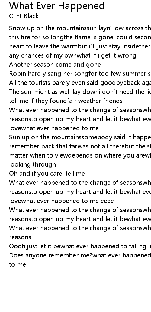 | What ever happened to the change of seasonswhat ever happened to all my reasonsto open up my heart and let it bewhat ever happened to falling in lovewhat ever happened to me | |