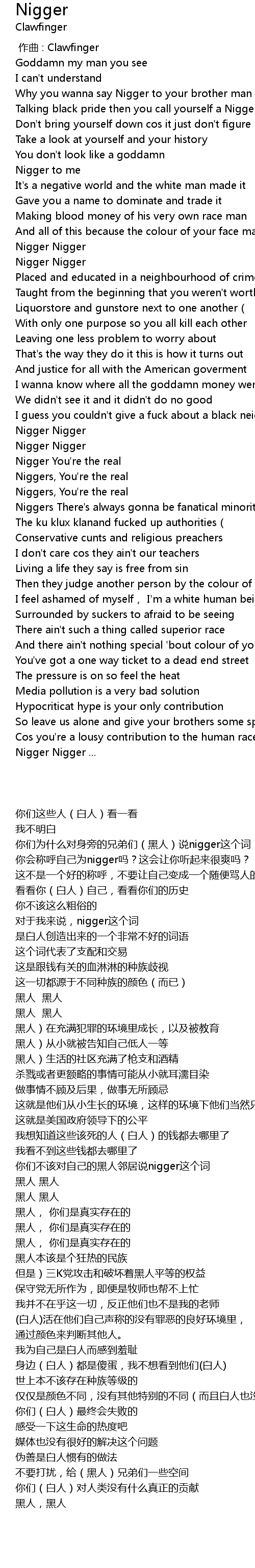 | [00:36.10] | 你会称呼自己为nigger吗?这会让你听起来很爽吗? |