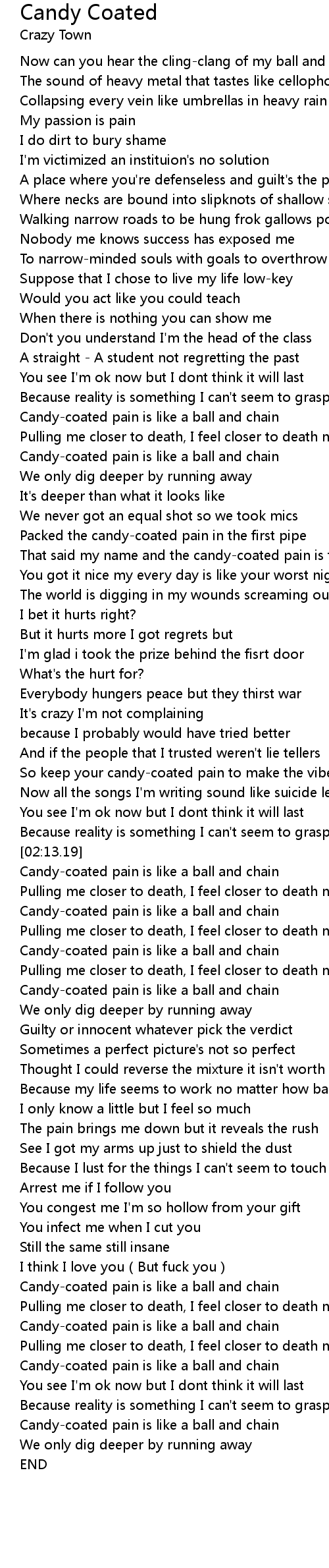 | [02:45.66] | Candy-coated pain is like a ball and chain |