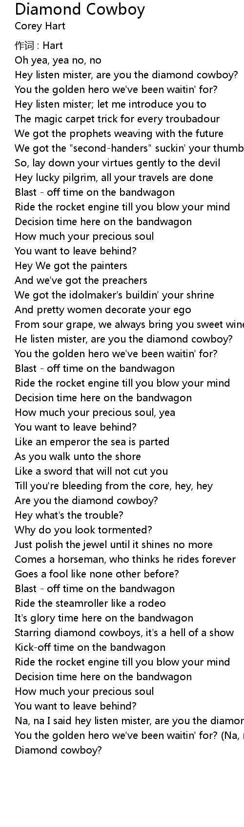 | Na, na I said hey listen mister, are you the diamond cowboy? | |