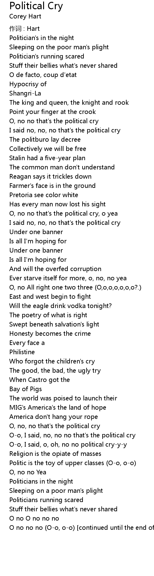 | O-o, I said, o, oh, no no political cry-y-y | |