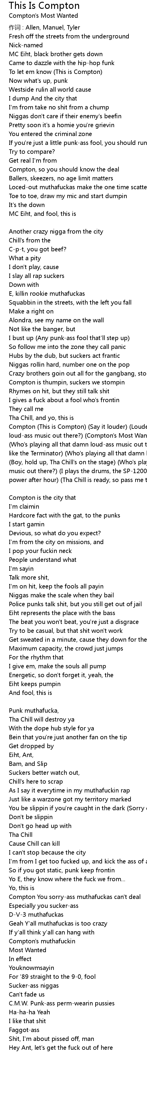 | Compton (This is Compton) (Say it louder) (Louder) (Who's playing all that damn loud-ass music out there?) (Compton's Most Wanted, punk, rollin four deep) (Who's playing all that damn loud-ass music out there?) (Eiht'll get crazy, kill like the Terminator) (Who's playing all that damn loud-ass music out there?) (Boy, hold up, Tha Chill's on the stage) (Who's playing all that damn loud-ass music out there?) (I plays the drums, the SP-1200) (Eiht is back again with power after hour) (Tha Chill is ready, so pass me the sack) [ VERSE 3: MC Eiht ] | |