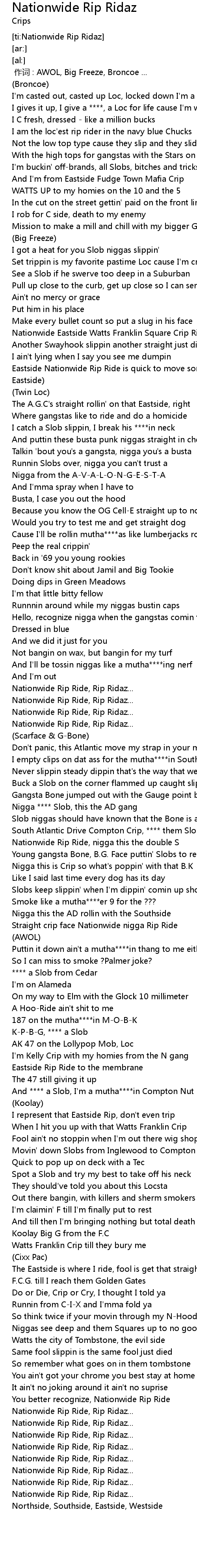 | [02:38.73] | South Atlantic Drive Compton Crip, **** them Slob niggas |