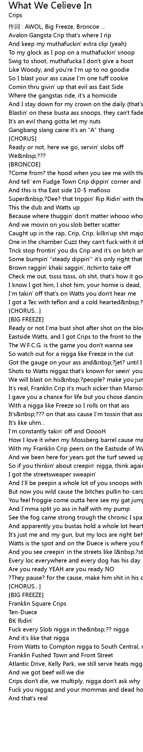 | Crips don' t die, we multiply, nigga don' t ask why | |