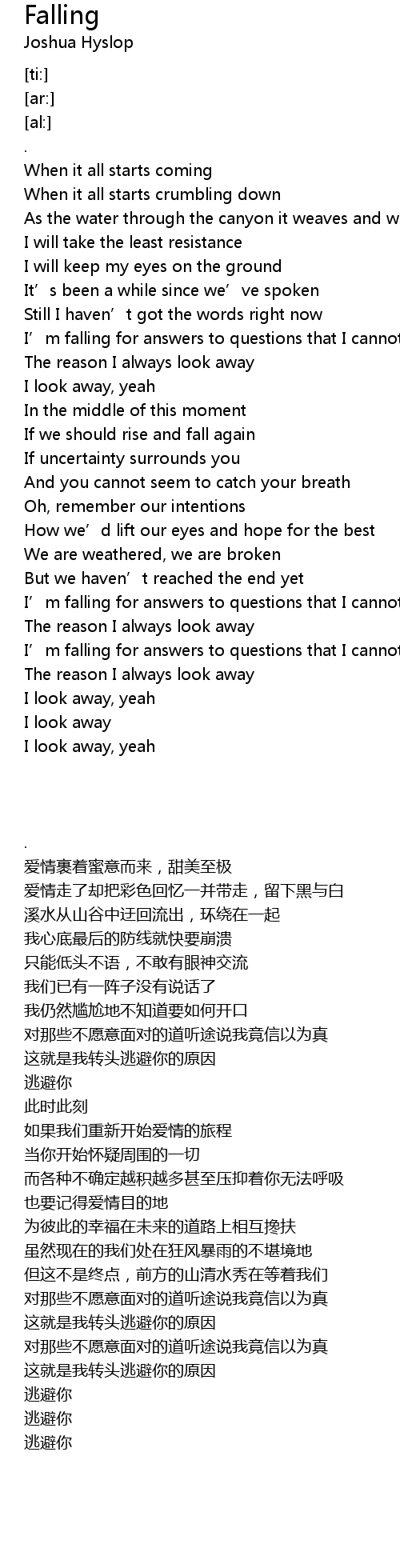 | [02:51.12] | I’m falling for answers to questions that I cannot face |