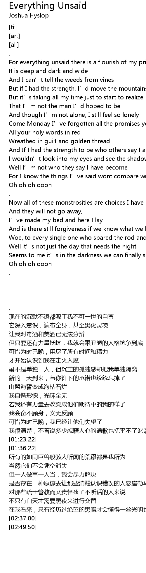 | [01:18.02] | 我很清楚,不管说多少慰藉人心的道歉也抚平不了讹谬所撕裂的伤口 |