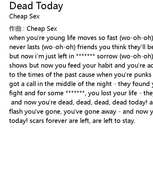 | when you' re young life moves so fast woohoh like a flash before your eyes it never lasts woohoh friends you think they' ll be there tomorrow woohoh but now i' m just left in sorrow woohoh friday night we' d go to the shows but now you feed your habit and you' re addiction grows whatever happened to the times of the past cause when you' re punks forever it is meant to last! got a call in the middle of the night they found you dead after you lost in a fight and for some , you lost your life they left you to bleed with a knife ... Chorus and now you' re dead, dead, dead, dead today! and in a flash you' ve gone, you' ve gone away and now you' re dead, dead, dead, dead today! scars forever are left, are left to stay. |