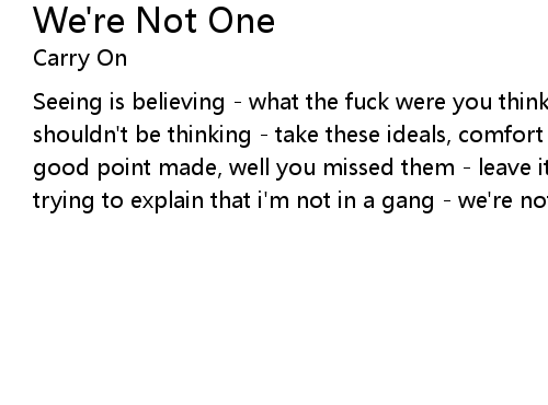| Seeing is believing - what the fuck were you thinking - on tv preaching when you shouldn't be thinking - take these ideals, comfort them and twist them - every good point made, well you missed them - leave it alone - i'm sick and tired of trying to explain that i'm not in a gang - we're not one in the same |