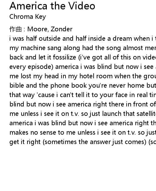 | i was half outside and half inside a dream when i thought i heard your voice on my machine sang along had the song almost memorized liked the track so i laid back and let it fossilize i' ve got all of this on video it just gets better every episode america i was blind but now i see america right there in front of me lost my head in my hotel room when the ground shook had to choose between the bible and the phone book you' re never home but that' s okay it' s so much easier that way ' cause i can' t tell it to your face in real time anyway america i was blind but now i see america right there in front of me and it makes no sense to me unless i see it on t. v. so just launch that satellite and get it right america i was blind but now i see america right there in front of me and it makes no sense to me unless i see it on t. v. so just launch that satellite and get it right sometimes the answer just comes sometimes the answer just comes |