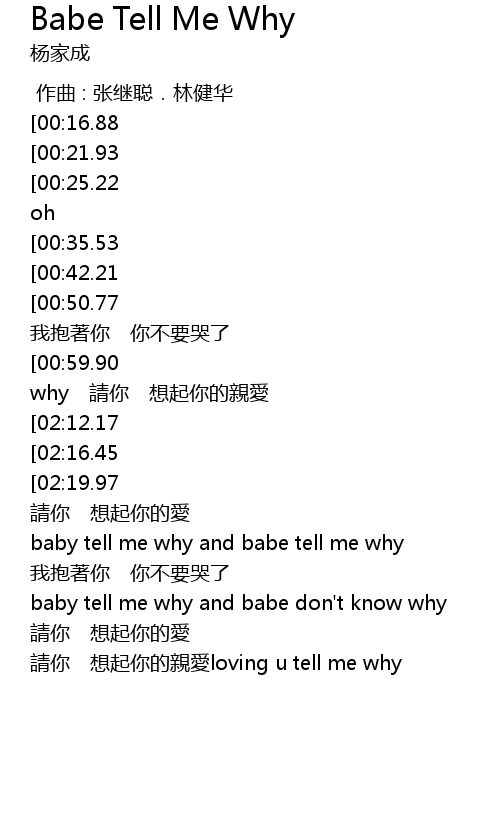 | [01:54.17][00:50.77] | △baby tell me why and babe tell me why 我抱著你 你不要哭了 |