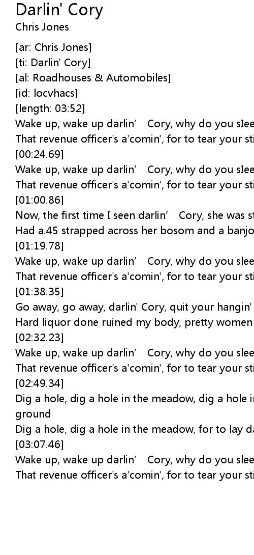 | [00:01.19] | Wake up, wake up darlin’ Cory, why do you sIeep so sound |