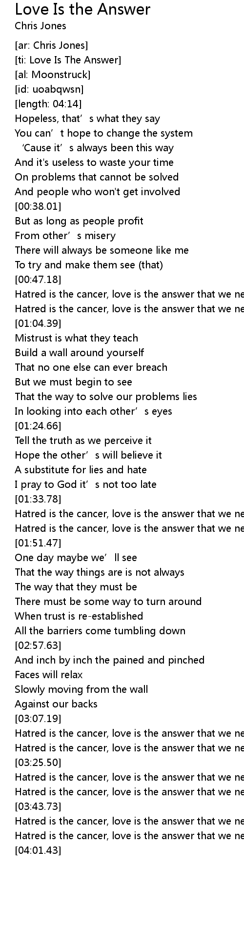 | [03:44.80] | Hatred is the cancer, love is the answer that we need |