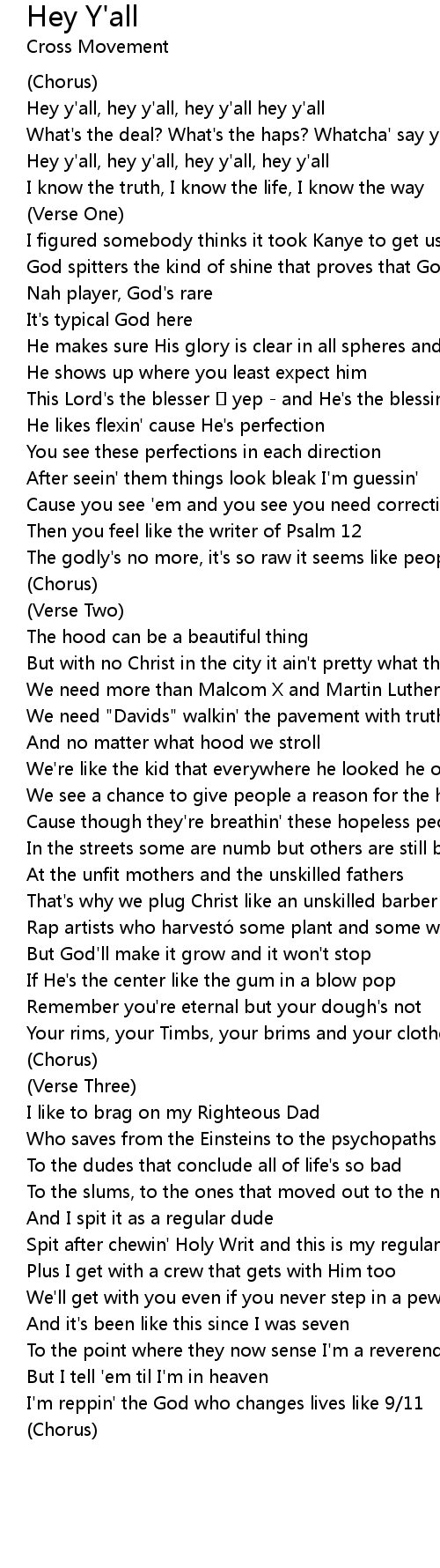 | Hey y' all, hey y' all, hey y' all hey y' all | |