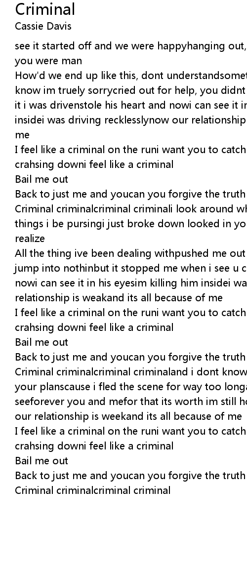 Criminal criminalcriminal criminali look around what am i doingall the wrong things i be pursingi just broke down looked in your eyesi saw your face made me realize |