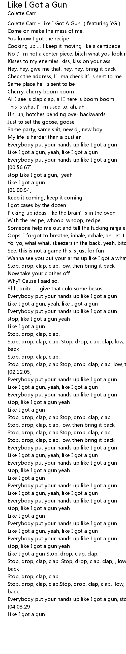 | [00:00.79] | Colette Carr Like I Got A Gun featuring YG |