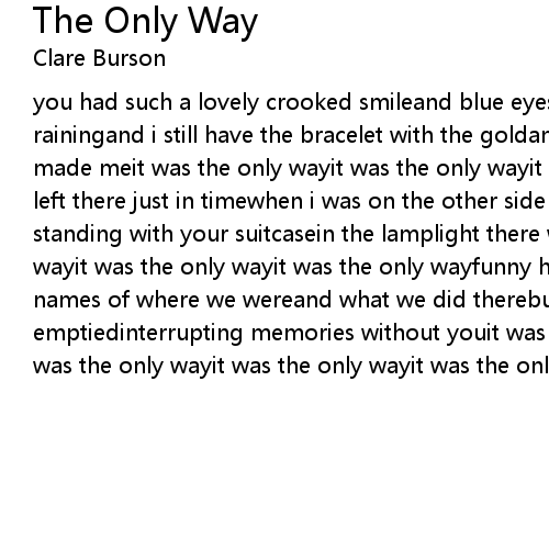 you had such a lovely crooked smileand blue eyes that were gray when it was rainingand i still have the bracelet with the goldand ivory clovers that you made meit was the only wayit was the only wayit was the only waysomeone said you left there just in timewhen i was on the other side waitingand i can see you standing with your suitcasein the lamplight there without meit was the only wayit was the only wayit was the only wayfunny how the details never fadethe names of where we wereand what we did therebut all i have are spaces emptiedinterrupting memories without youit was the only wayit was the only wayit was the only wayit was the only wayit was the only way