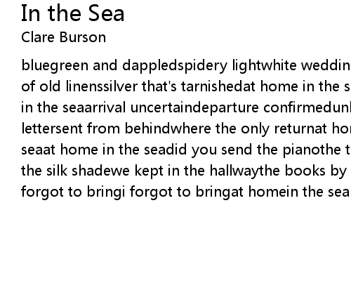 bluegreen and dappledspidery lightwhite wedding chinacut crystal glassesa trunk of old linenssilver that's tarnishedat home in the seaat home in the seaat home in the seaarrival uncertaindeparture confirmedunknown destinationlost in a lettersent from behindwhere the only returnat home in the seaat home in the seaat home in the seadid you send the pianothe tables and chairsthe lamp with the silk shadewe kept in the hallwaythe books by my bedsidethe family photosi forgot to bringi forgot to bringat homein the sea |
