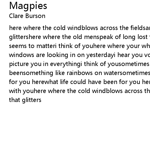 here where the cold windblows across the fieldsand the magpiesgather all that glittershere where the old menspeak of long lost thingsin a languagethat never seems to matteri think of youhere where your white wallscolor in the pastand the windows are looking in on yesterdayi hear you voicesquiet like the nighti picture you in everythingi think of yousometimes i thinkthat you might have beensomething like rainbows on watersometimes i think of howlife must have been for you herewhat life could have been for you herewhat life should have beenhere with youhere where the cold windblows across the fieldsand the magpiesgather all that glitters