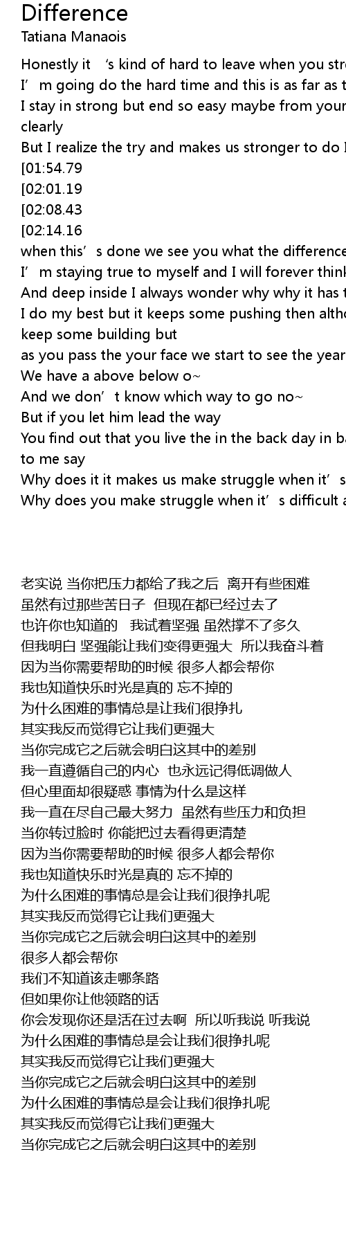 | [01:04.42][02:08.43] | Why does it make us struggle when it’s difficult as it is |