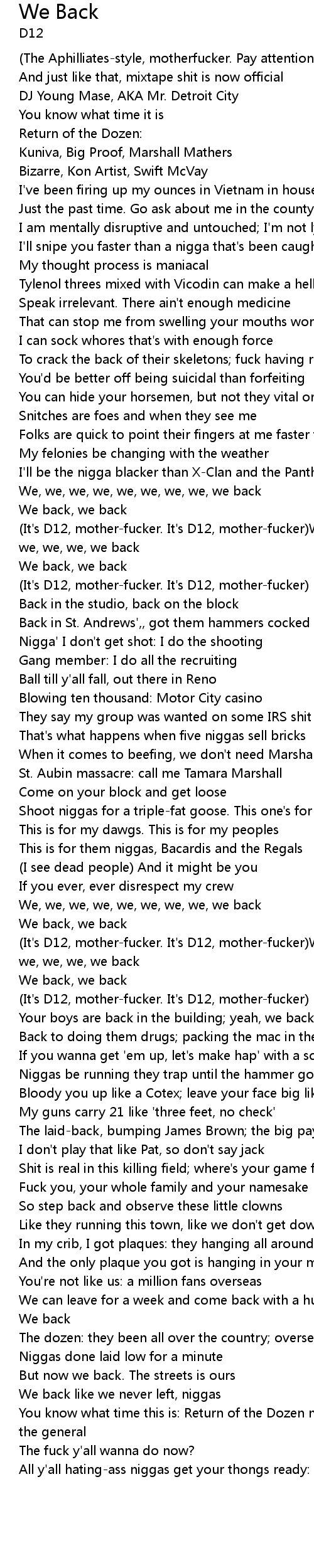 (It's D12, mother-fucker. It's D12, mother-fucker)We, we, we, we, we, we, we, we, we back |