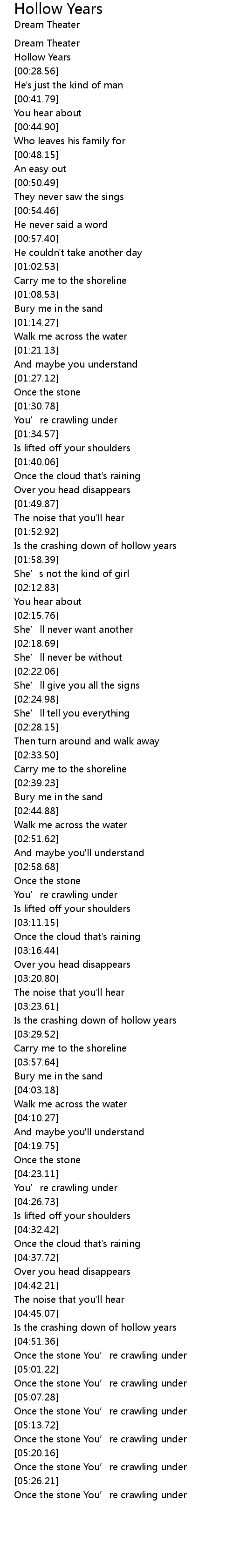 | [05:01.90] | Once the stone You' re crawling under |