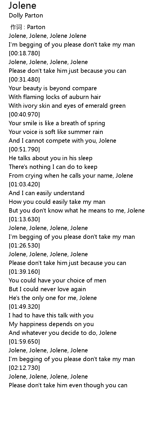 | [01:16.260] | Jolene, Jolene, Jolene, Jolene |