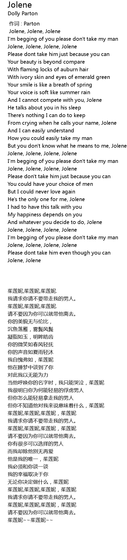 | [02:12.500] | Jolene, Jolene, Jolene, Jolene |