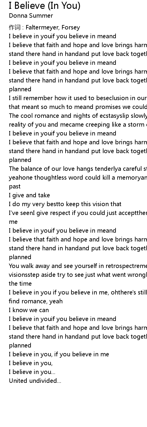 | I believe that faith and hope and love brings harmonyunited once againwe' ll stand there hand in handand put love back together just the way we' ve always planned | |
