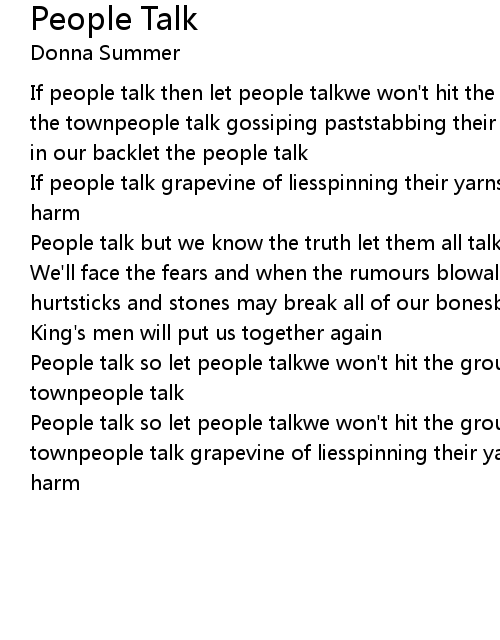 If people talk then let people talkwe won't hit the ground if we are the talk of the townpeople talk gossiping paststabbing their words with all of their stares in our backlet the people talk |