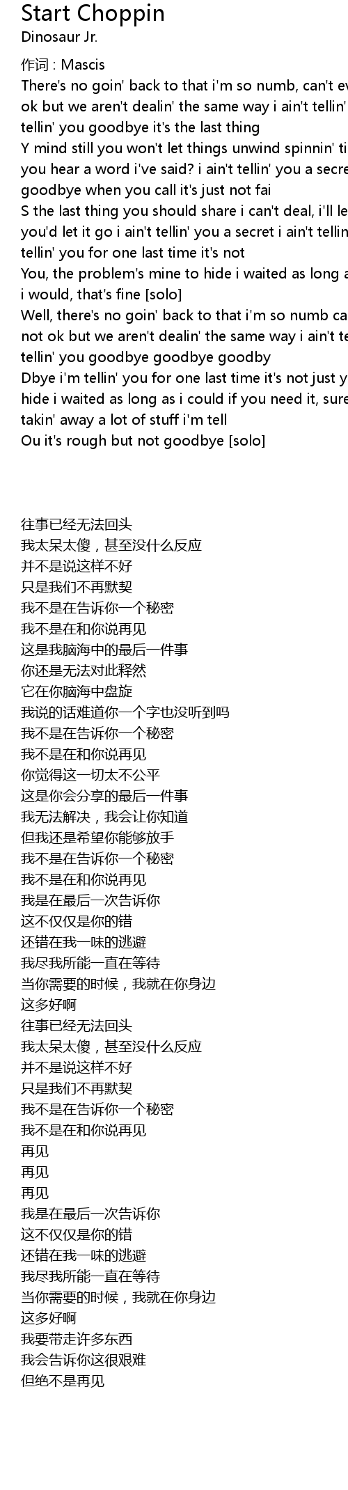 | Well, there' s no goin' back to that i' m so numb can' t even react didn' t say it' s not ok but we aren' t dealin' the same way i ain' t tellin' you a secret i ain' t tellin' you goodbye goodbye goodby | |