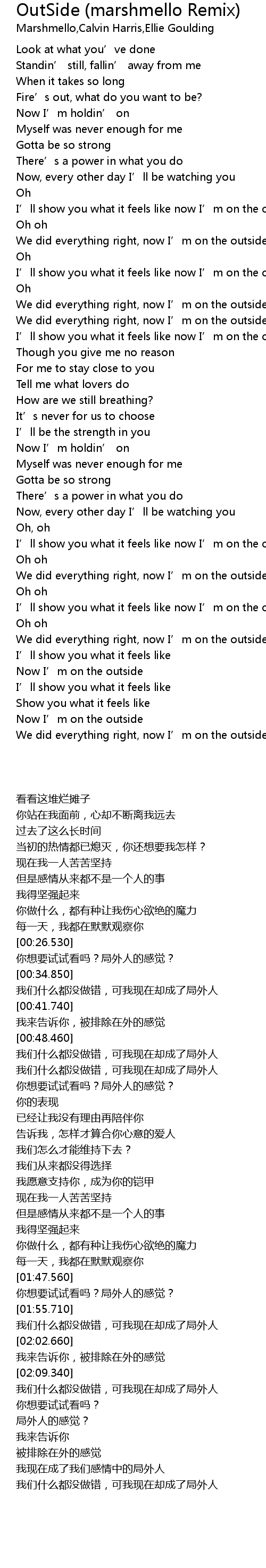 | [00:43.510] | I' ll show you what it feels like now I' m on the outside |