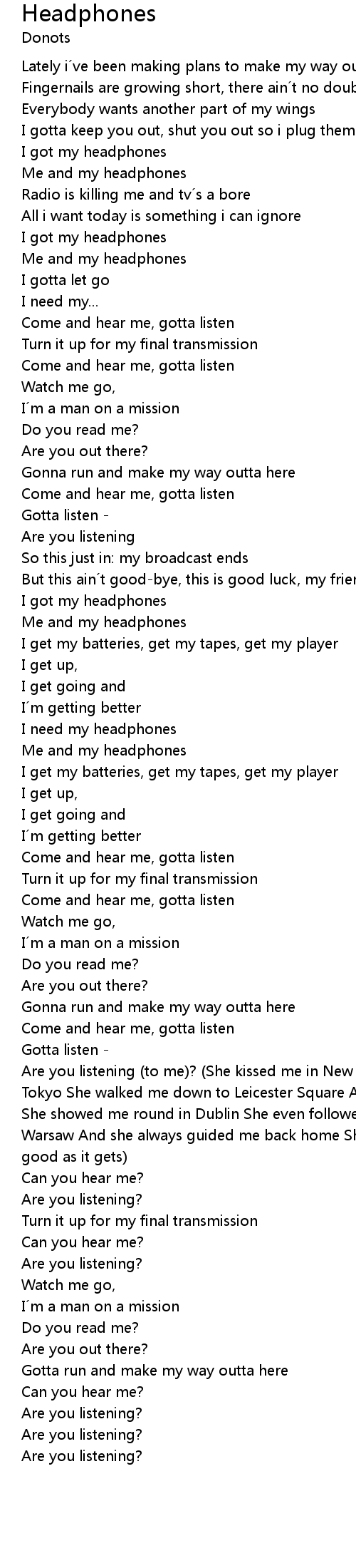 | Are you listening (to me)? (She kissed me in New York City She held my hand in Tokyo She walked me down to Leicester Square And she found me passed out in Soho She showed me round in Dublin She even followed me to Rome She kept me warm in Warsaw And she always guided me back home She´s as good as it gets, she´s as good as it gets) | |