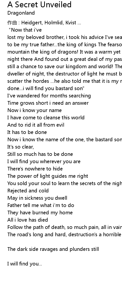 | Music: Holmlid , Magnusson , Kvist Lyrics: Magnusson, Heidgert " Now that i' ve lost my beloved brother, i took his advice I' ve searched for the one he claimed to be my true father... the king of kings The fearsome lord of the mithril mountain the king of dragons! It was a warm yet expected welcome, i spent many a night there And found out a great deal of my past, and i was told that there' s still a chance to save our kingdom and world! The leader of the dark hordes the dweller of night, the destructor of light he must be destroyed in order to scatter the hordes ... he also told me that it is my real brother... It will be done... i will find you bastard son" | |