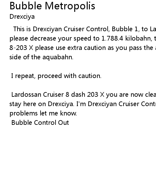 | This is Drexciyan Cruiser Control, Bubble 1, to Lardossen cruiser 8-203 X, please decrease your speed to 1.788.4 kilobahn, thank you. Lardossen cruiser 8-203 X please use extra caution as you pass the aqua construction site on the side of the aquabahn. | |