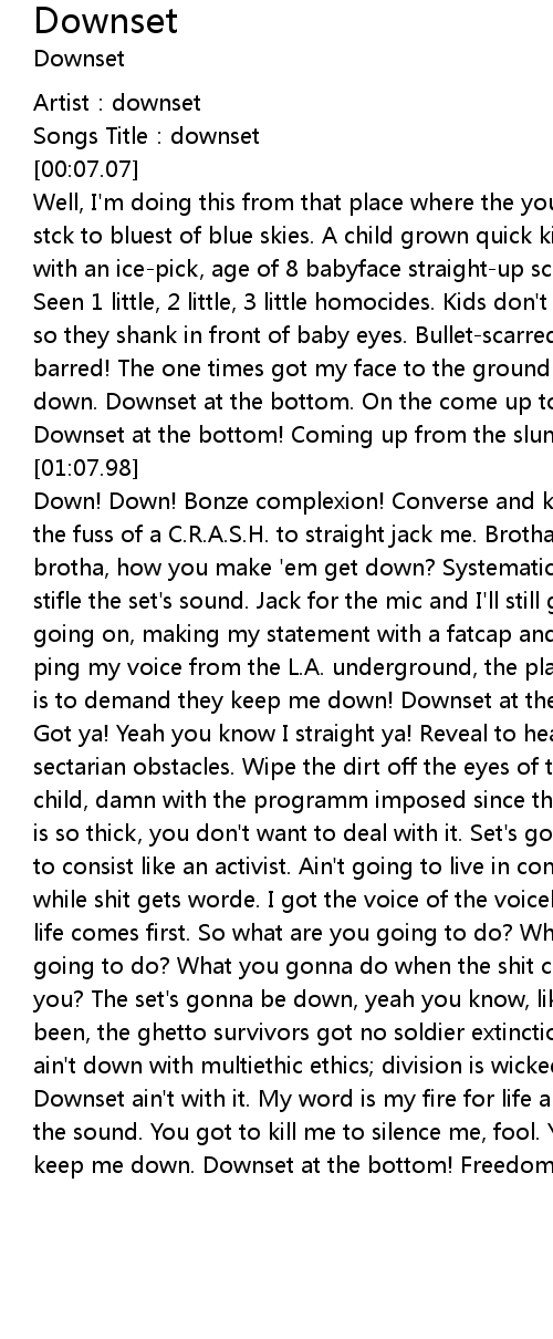| [01:02.99] | Downset at the bottom! Coming up from the slum! Down! Down! |