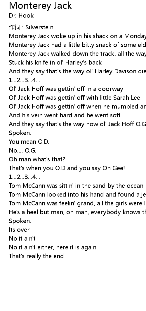 | Monterey Jack walked down the track, all the way to ol' Harley's shack | |