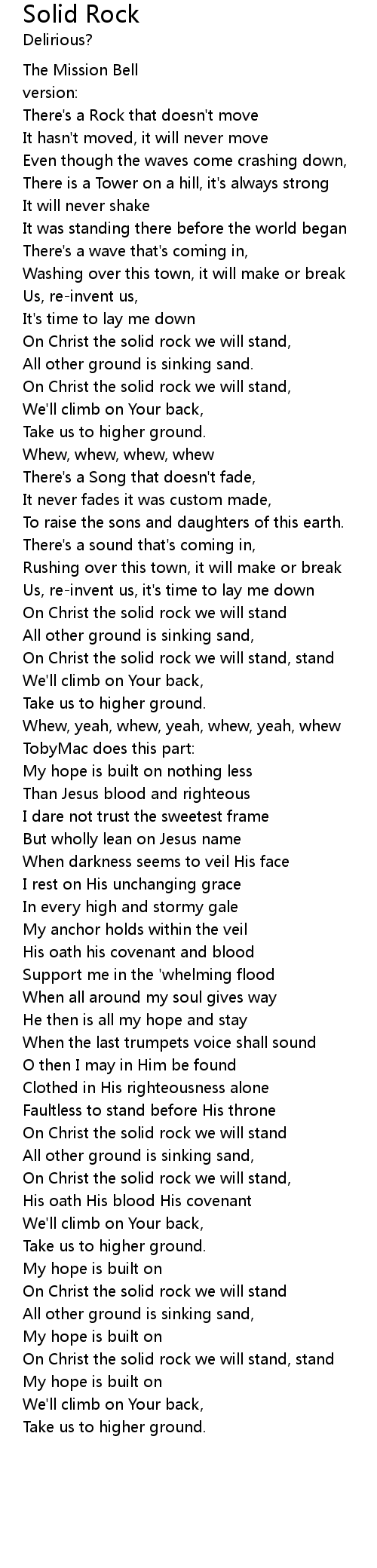 On Christ the solid rock we will stand, |