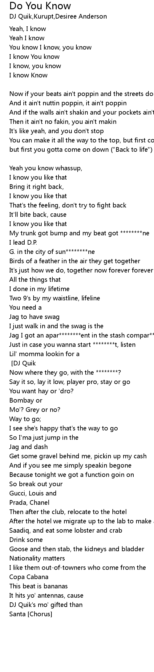 | G Yeah she lookin for a ******** like me (like me) [Chorus] [DJ Quik] | |