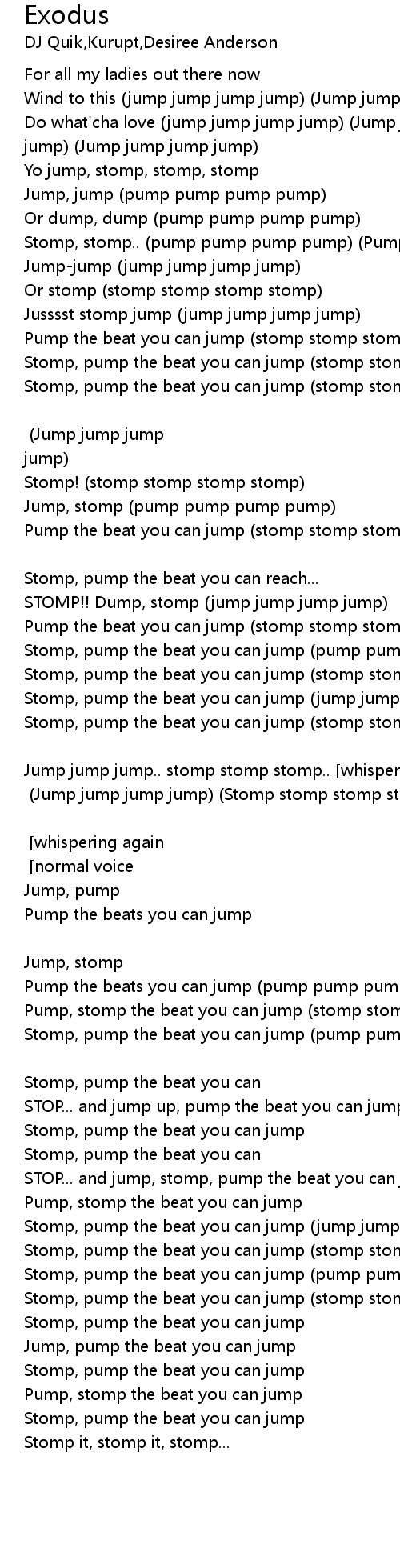 | Jump jump jump.. stomp stomp stomp.. [whispering for all intents inaudibly] [repeat 2X] (Jump jump jump jump) (Stomp stomp stomp stomp) (Pump pump pump pump) (Stomp stomp stomp stomp) [whispering gradually gets louder] | |