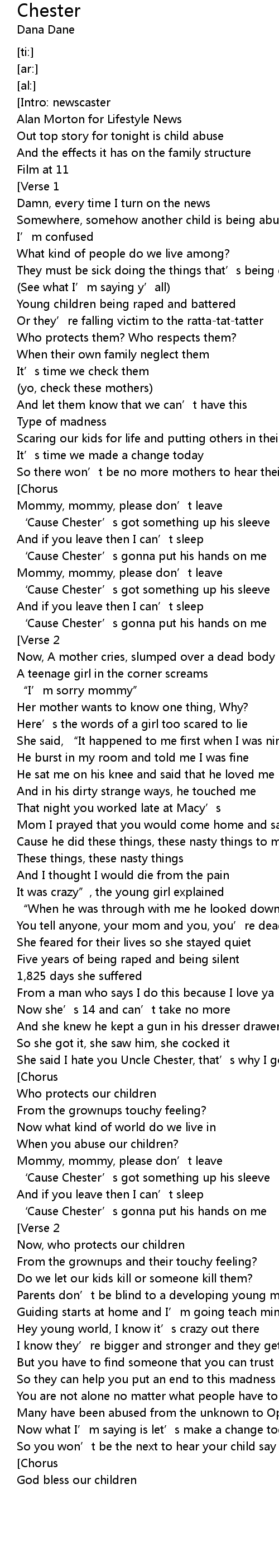 | [00:13.19] | Somewhere, somehow another child is being abused |