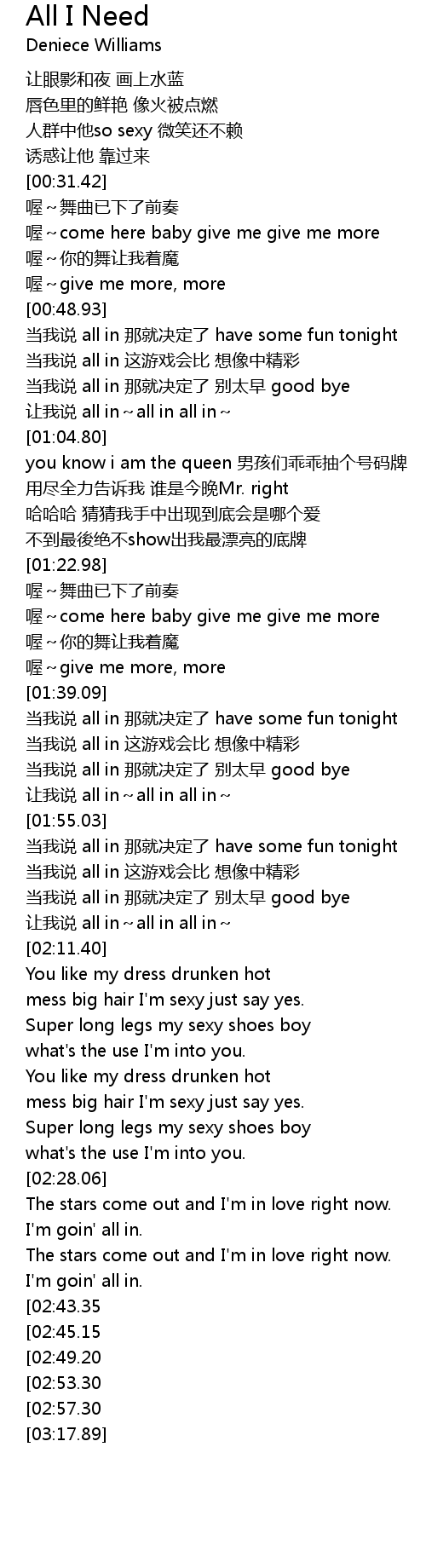 | [03:00.93][02:45.15] | 当我说 all in 那就决定了 have some fun tonight |