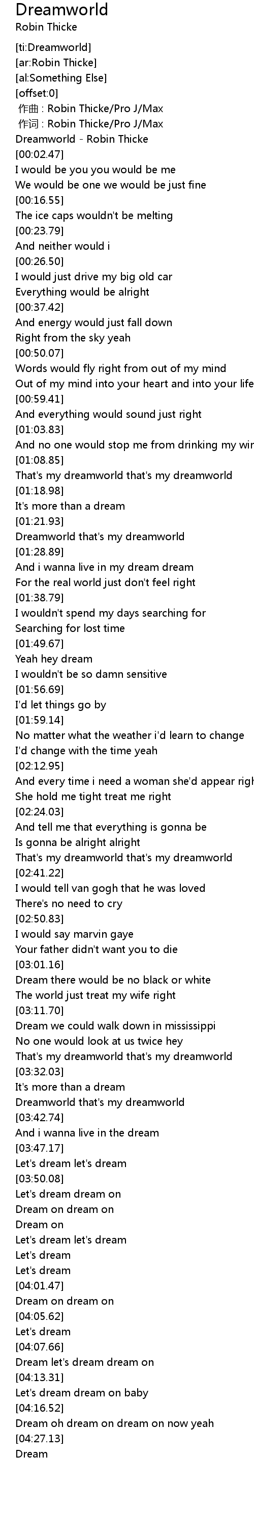 | [00:00.93] | Dreamworld - Robin Thicke |