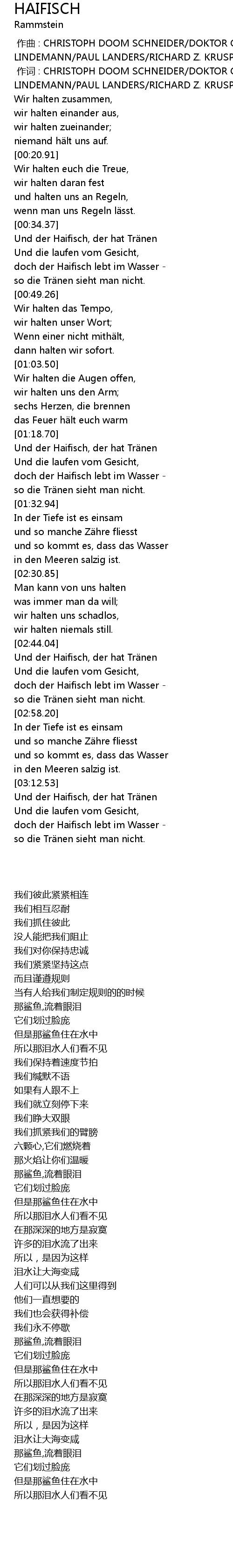 | [00:01.000] | 作词 : CHRISTOPH DOOM SCHNEIDER/DOKTOR CHRISTIAN LORENZ/TILL LINDEMANN/PAUL LANDERS/RICHARD Z. KRUSPE/OLIVER RIEDEL |