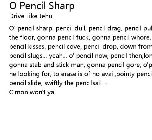 O' pencil sharp, pencil dull, pencil drag, pencil pull, gonna pencil pokeya' to the floor, gonna pencil fuck, gonna pencil whore, o' pencil vuture,pencil dove, pencil kisses, pencil cove, pencil drop, down from abovespittin' pencil bullets pencil slugs... yeah... o' pencil now, pencil then,long before ya had a pen, gonna stab and stick man, gonna pencil gore, o'pencil get the response, the one he looking for, to erase is of no avail,pointy pencil will prevail, slippery the pencil slide, swiftly the pencilsail. - |