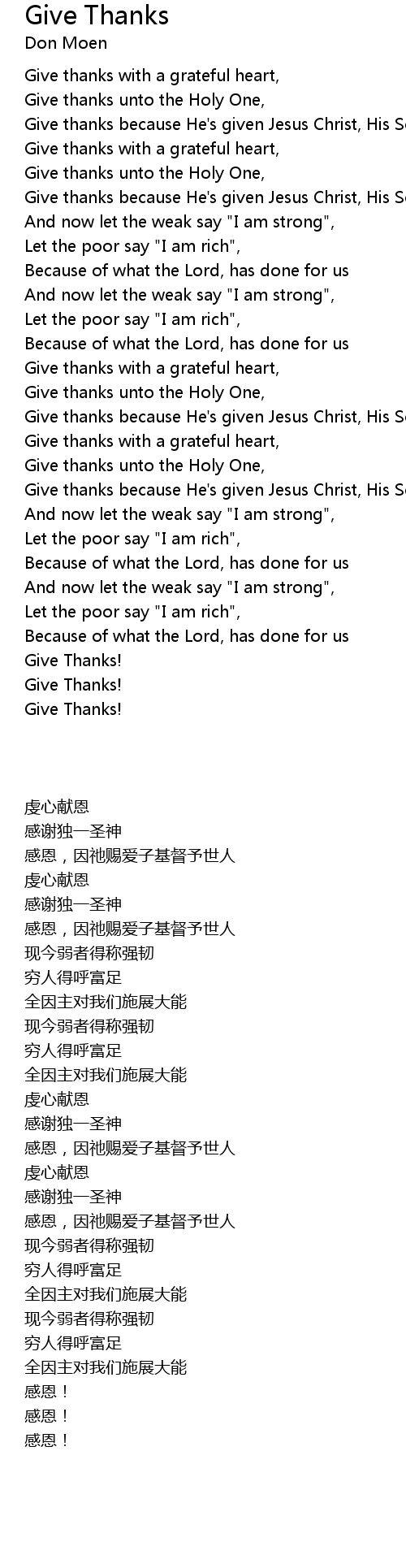 | [00:15.430] | Give thanks with a grateful heart, |